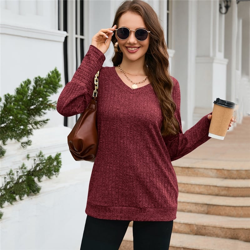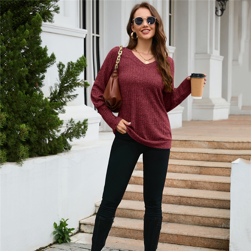 Women's Long-Sleeved T-Shirt Brushed Pitted V-Neck Solid Color T-Shirt