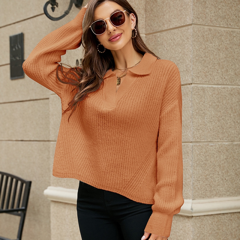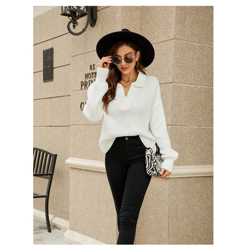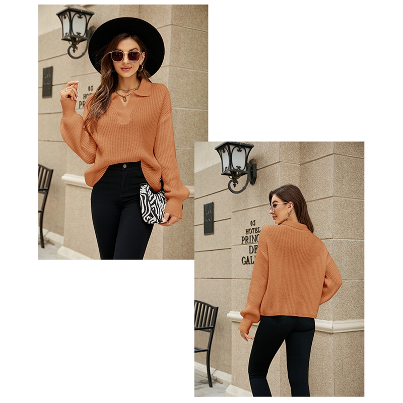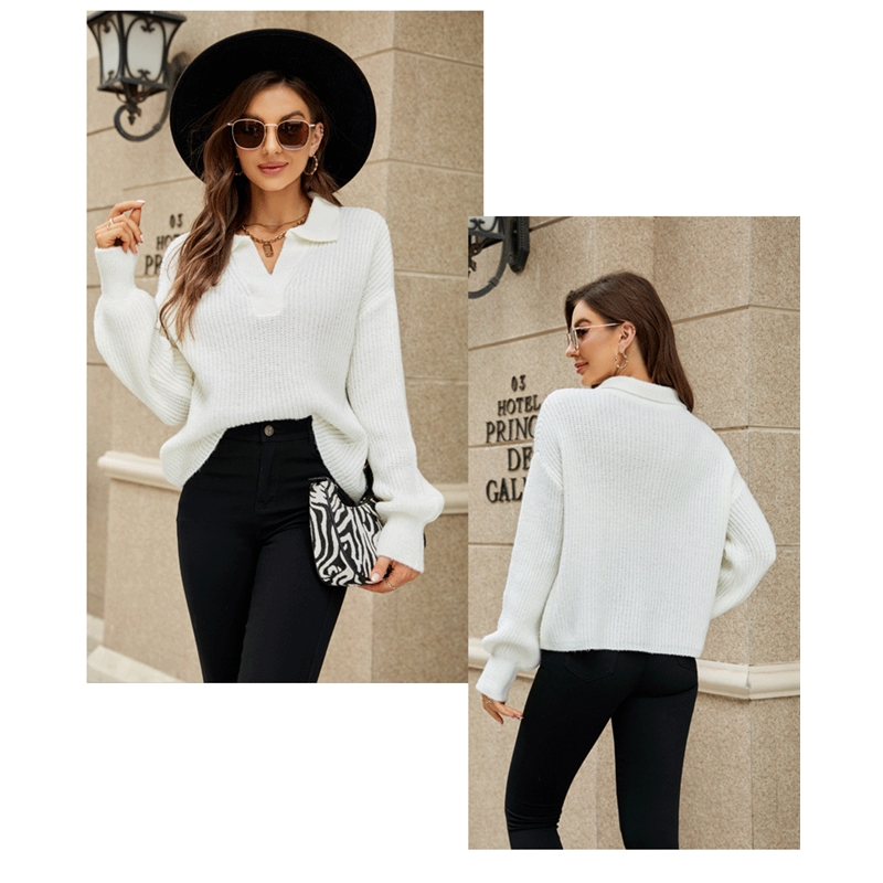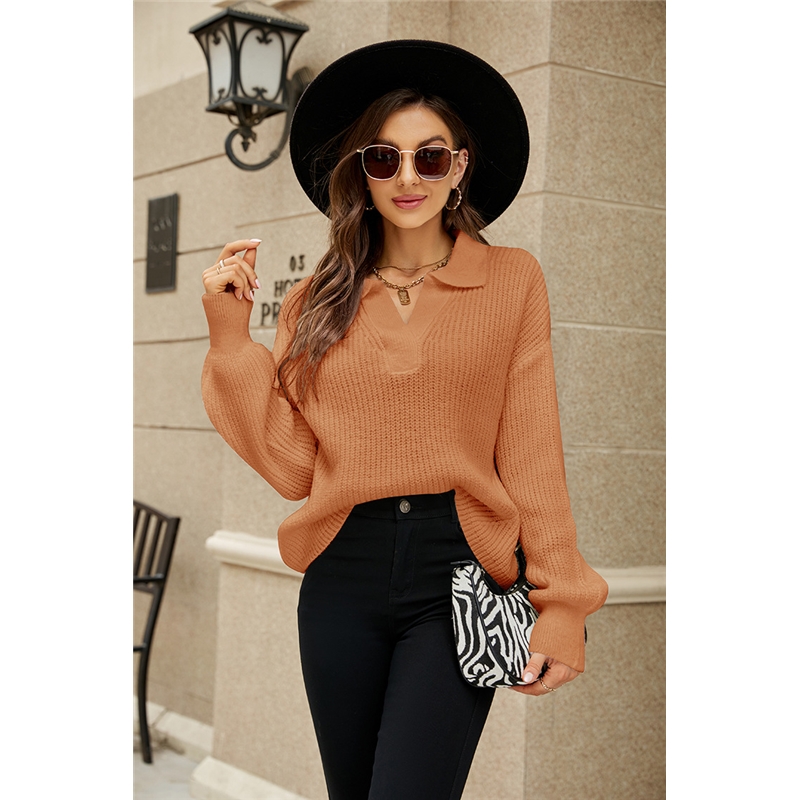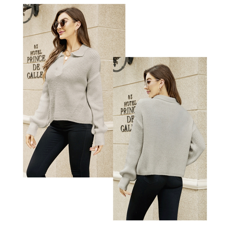 Long Sleeves Lapel Solid Color Casual Loose Knitted Sweater