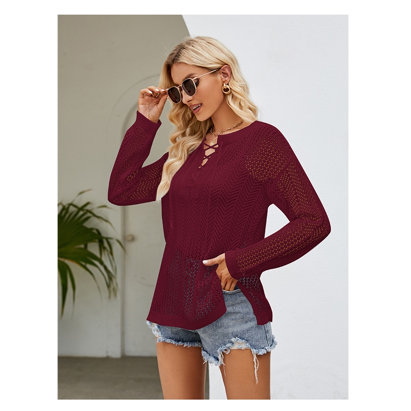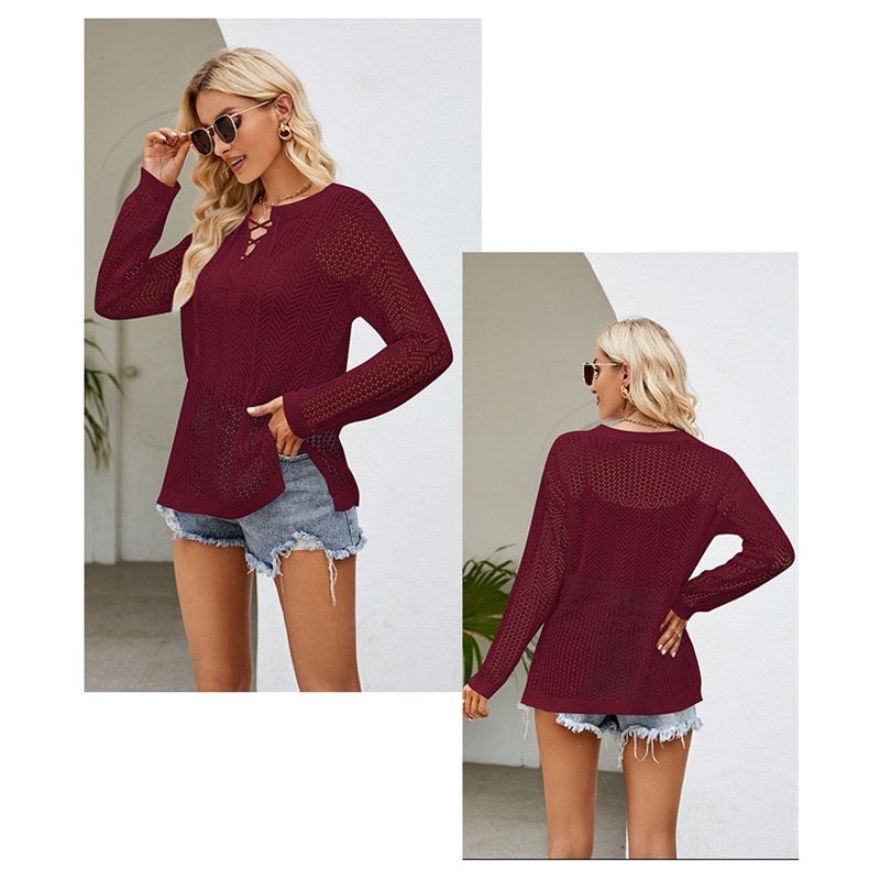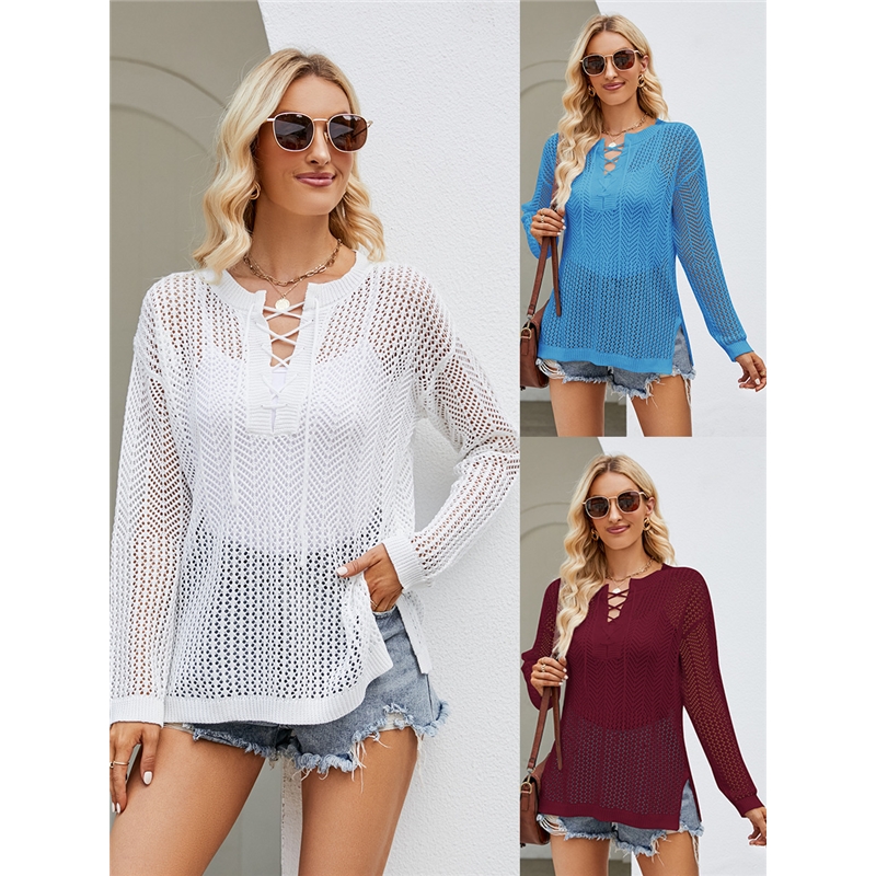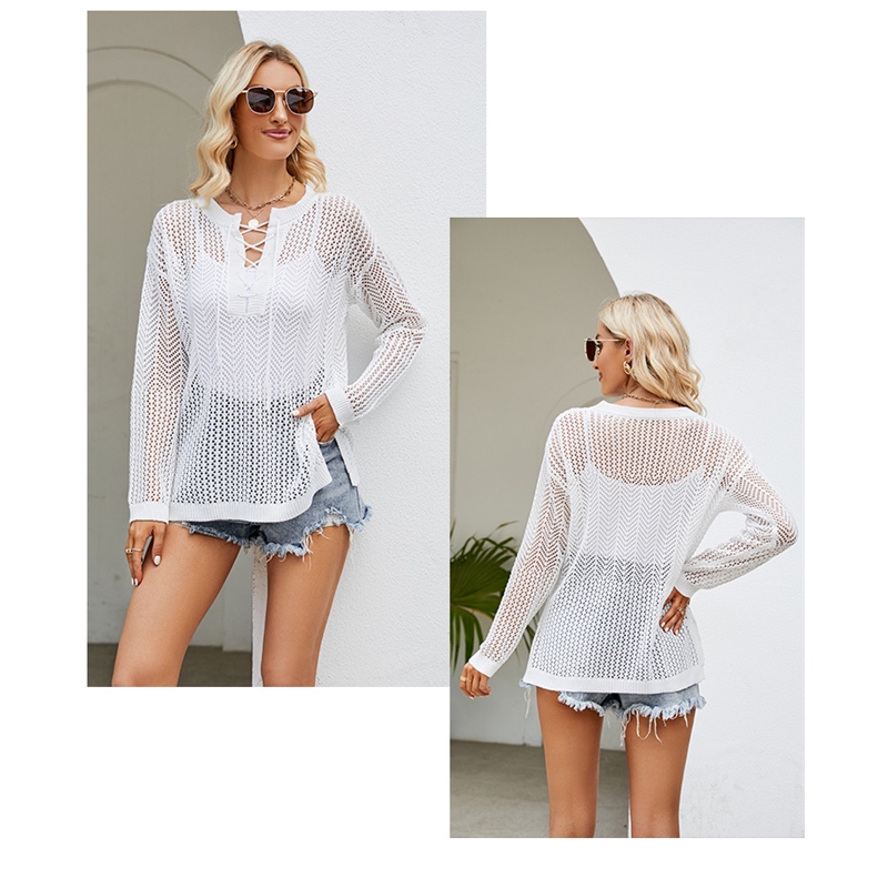Solid Color Long Sleeves Slit Casual Loose Thin Hollow Knitted Cover-Up
