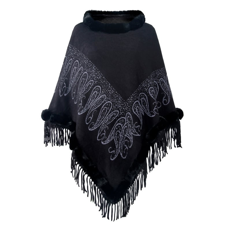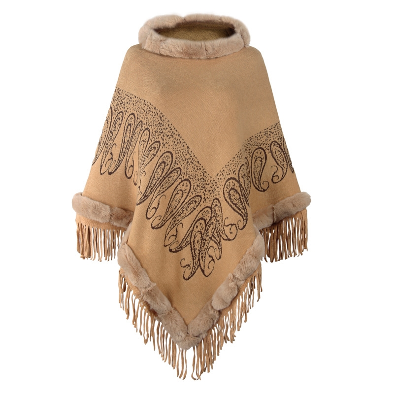 Fur Collar Cape With Printed Tassel Hem Shawl