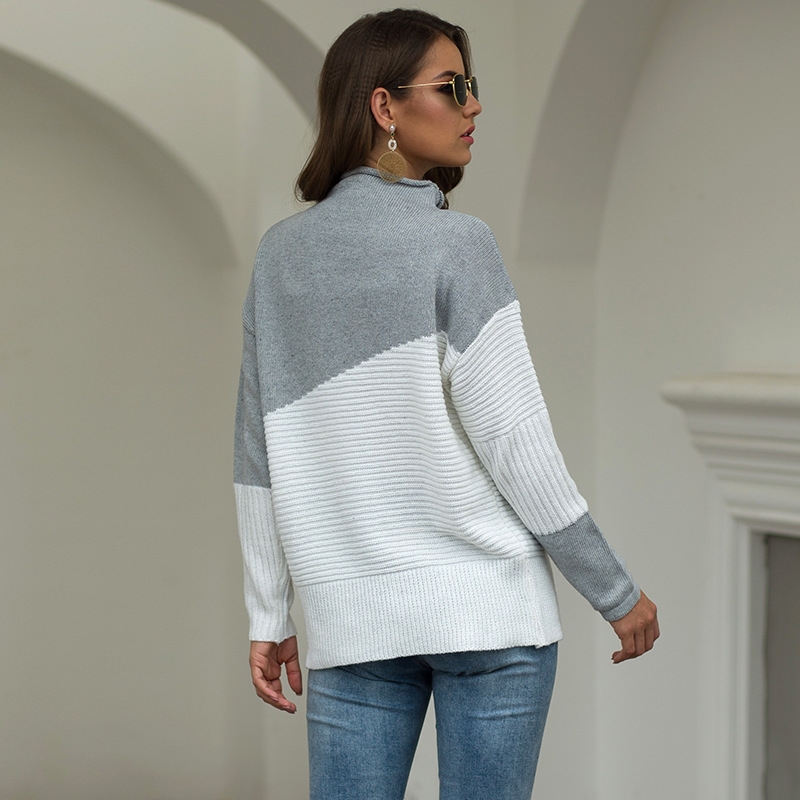 Rolled Edge Irregular Sleeves Half High Collar Contrasting Color Pullover Sweater