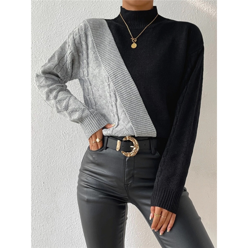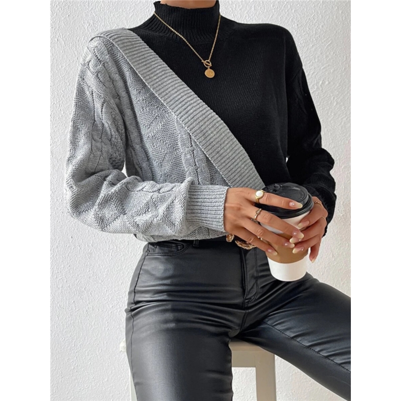 1. This Contrast Color Half Turtleneck Twisted Knitted Sweater is made of a soft, breathable knitted fabric, providing a comfortable and cozy fit.