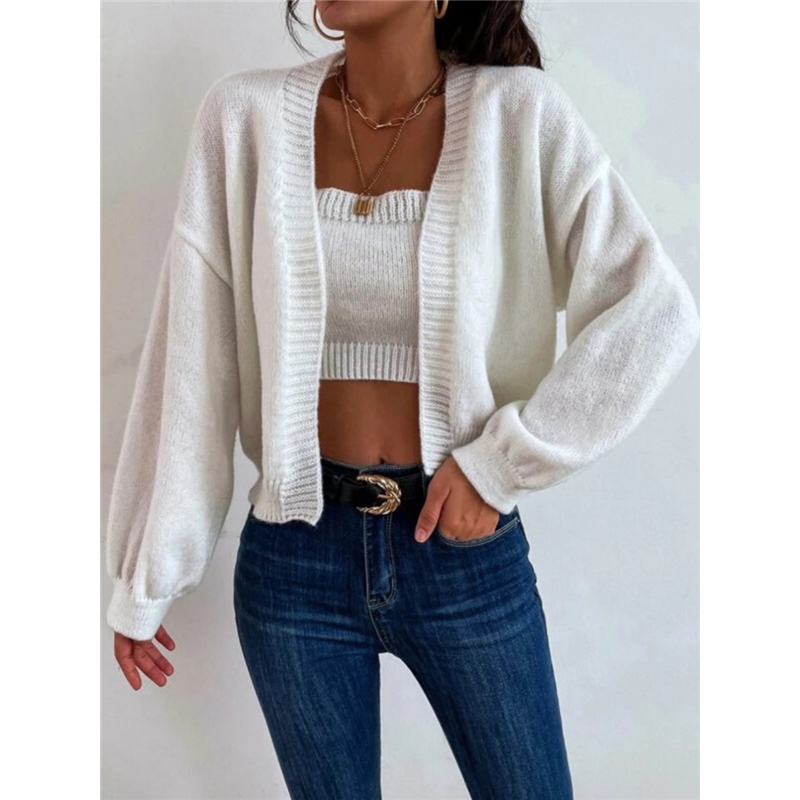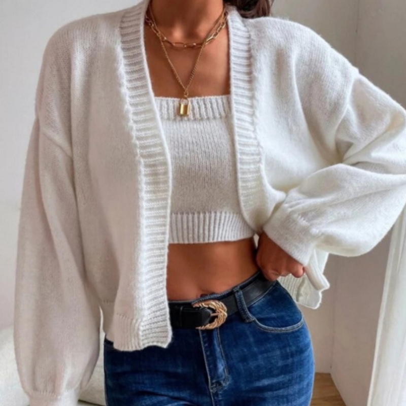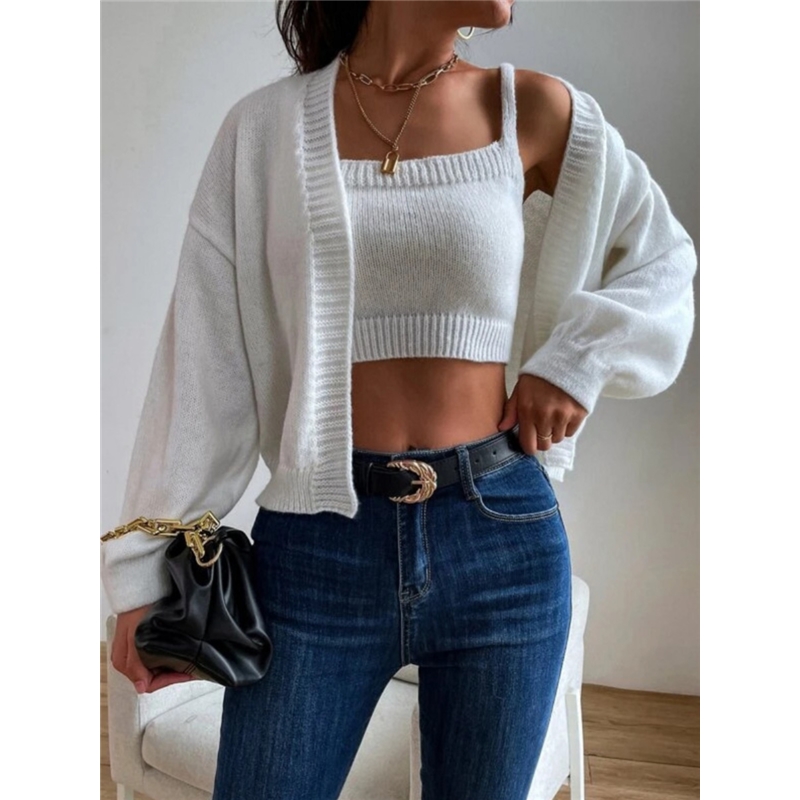 Solid Color Long Sleeves Short Knitted Cardigan And Tank Top Two Piece Suit