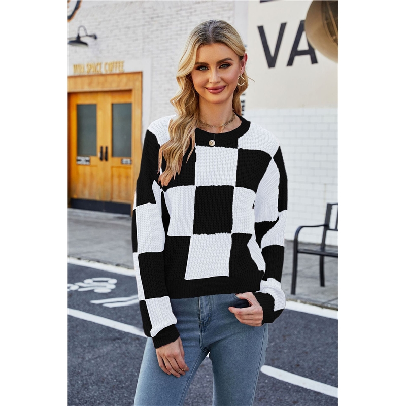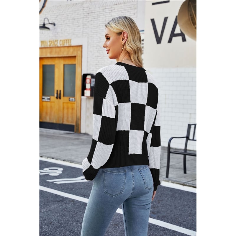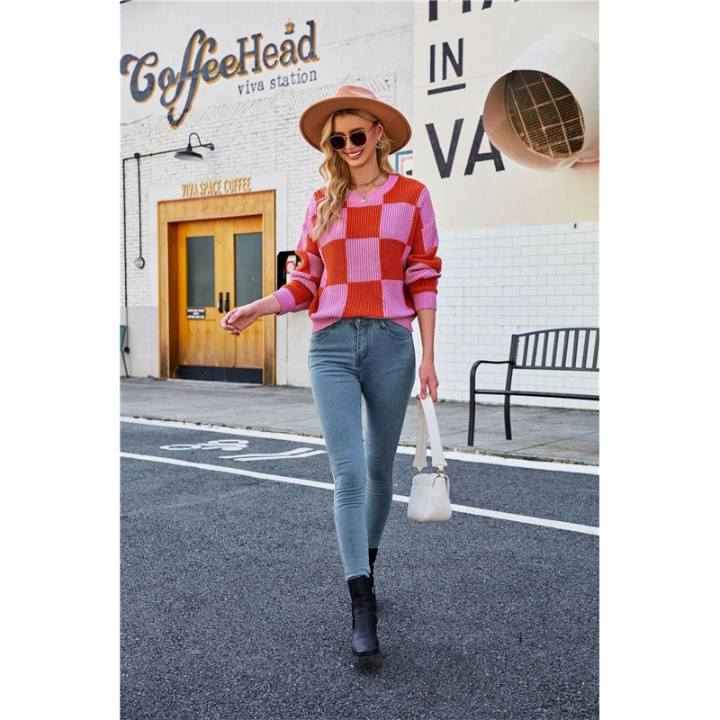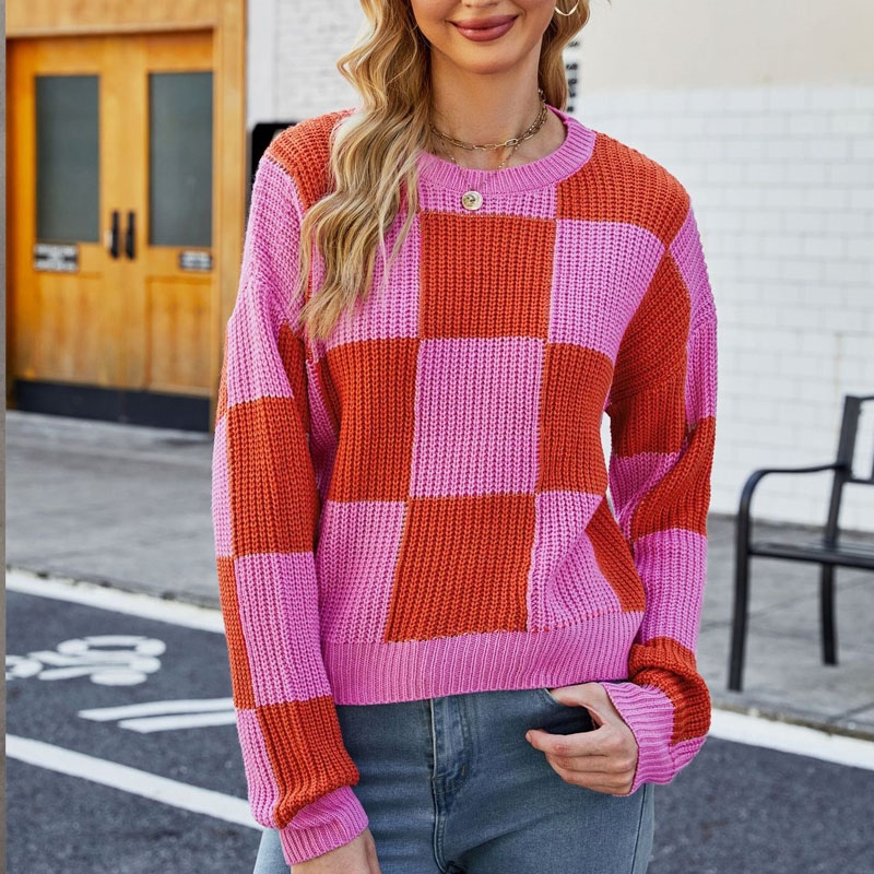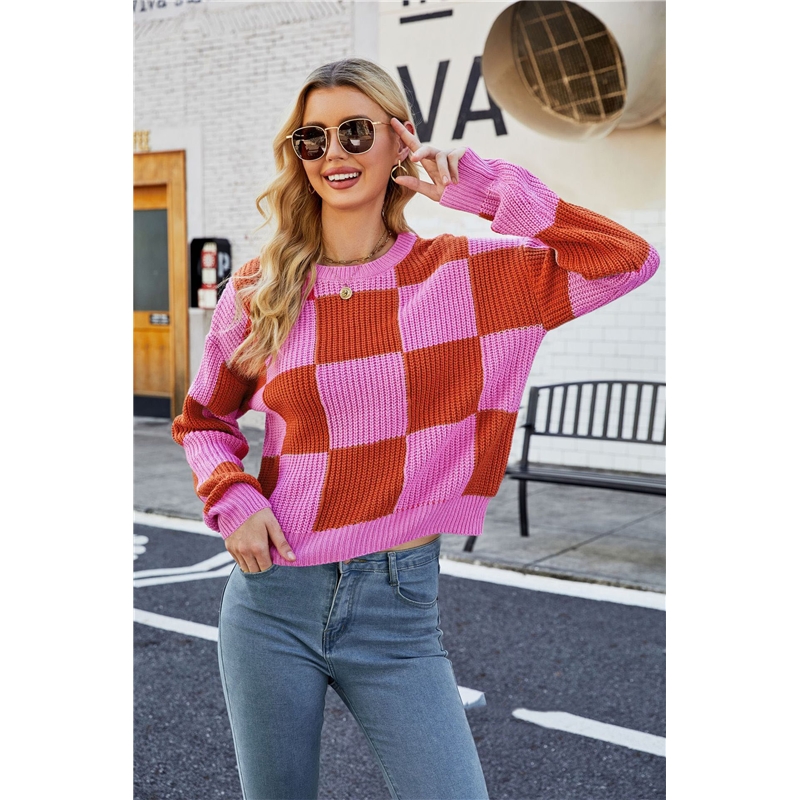 Crewneck Long Sleeves Contrast Color Plaid Short Sweater