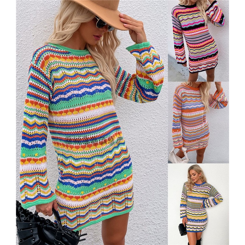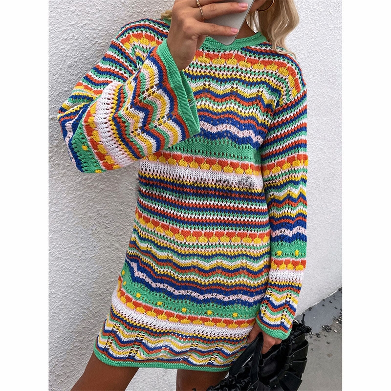 Long Sleeves Crewneck Contrast Color Midi Pullover Sweater