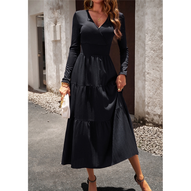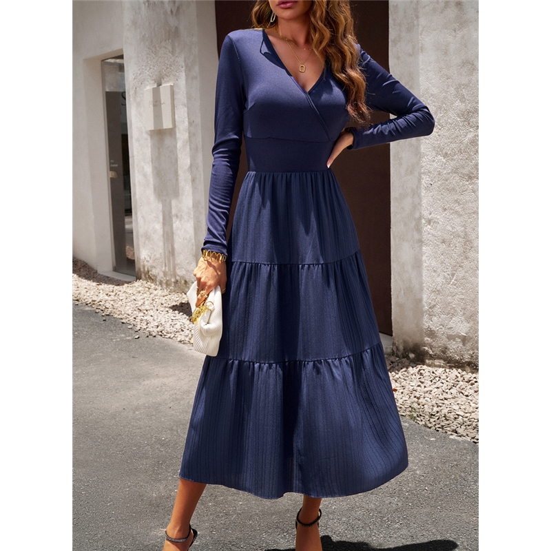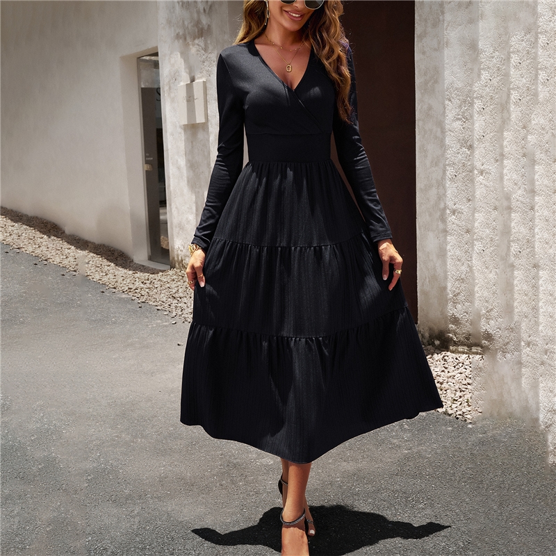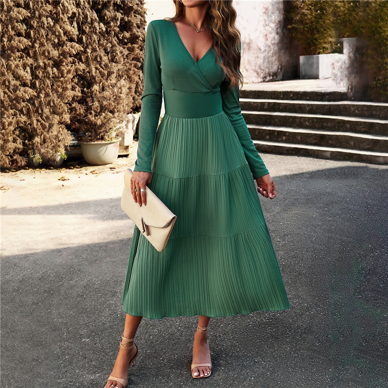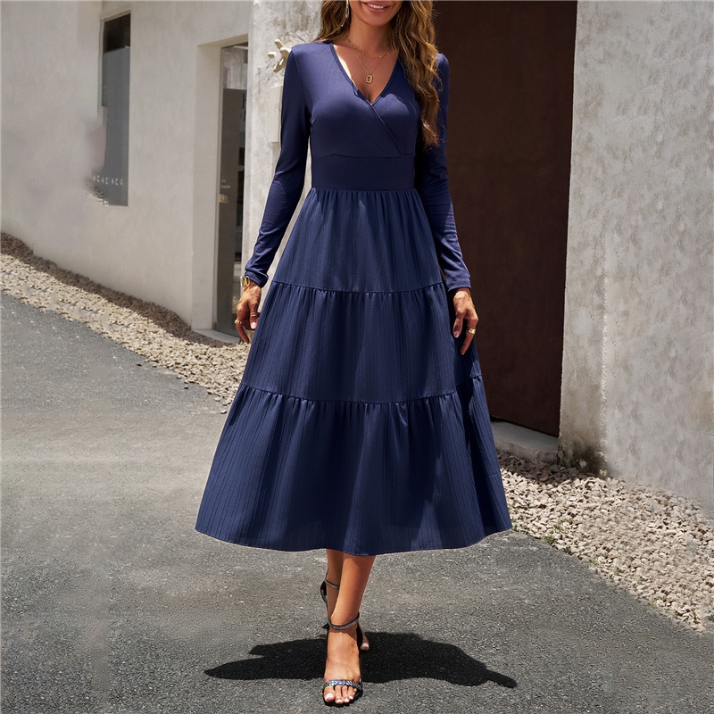 Solid Color V Neck Long Sleeve Dress