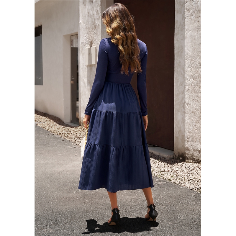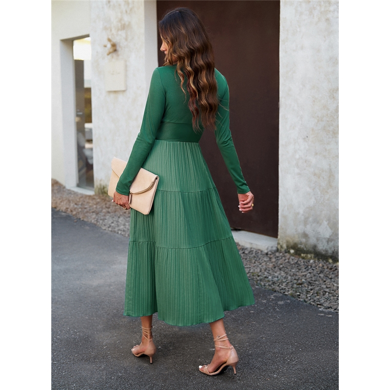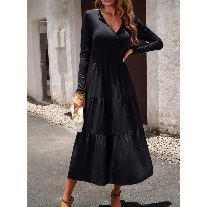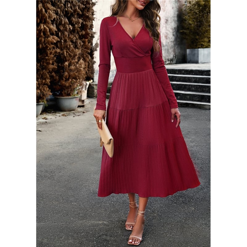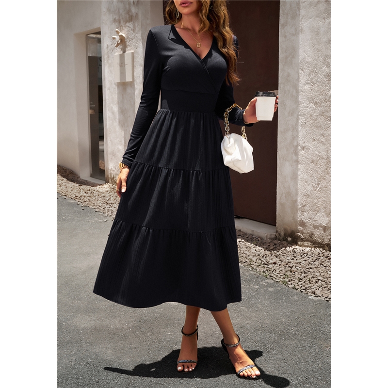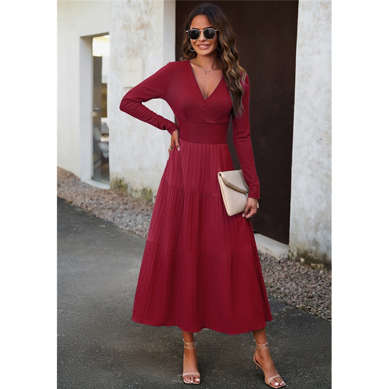 Solid Color V Neck Long Sleeve Dress