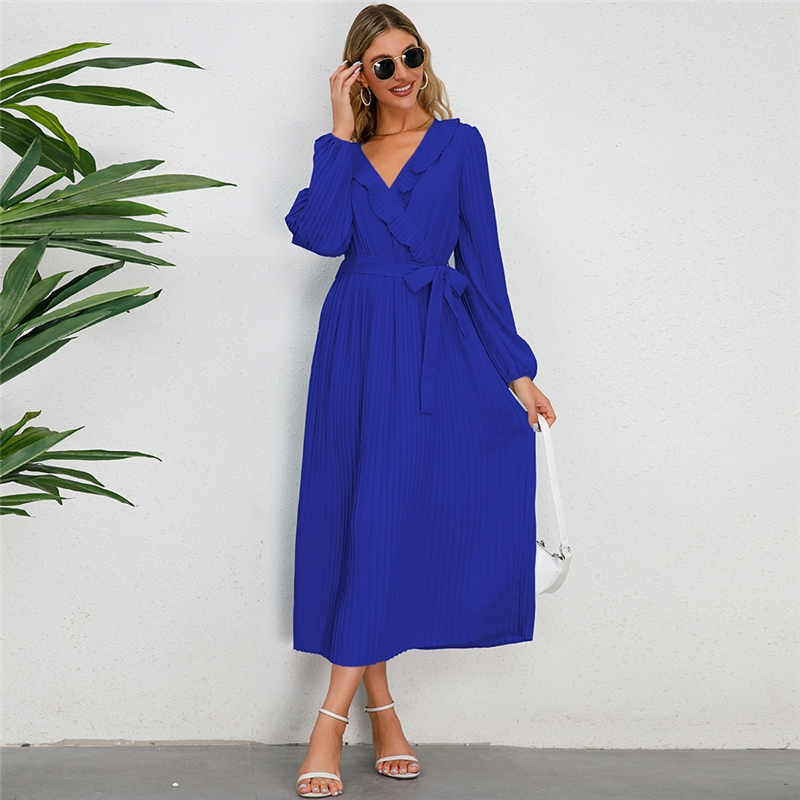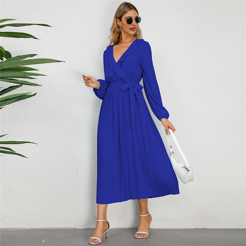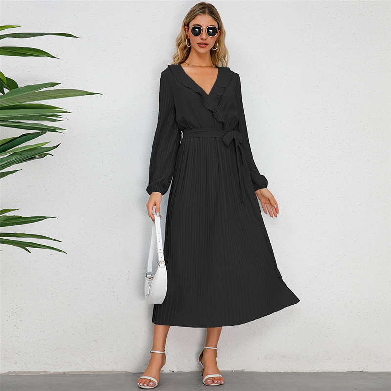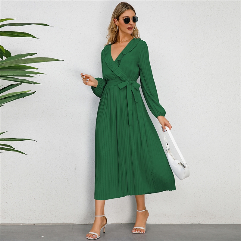 Solid Color Ruffled V-Neck Long-Sleeved Dress