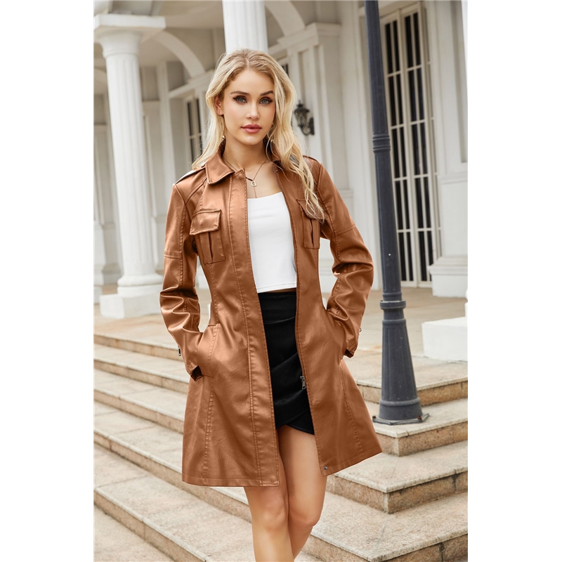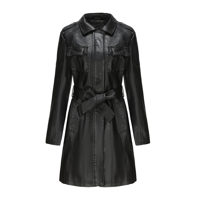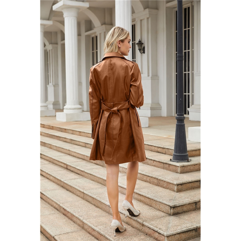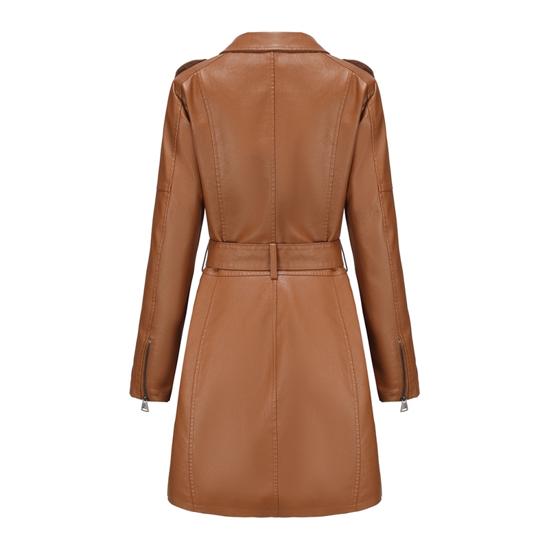 Solid Color Long Sleeves Lapel Zipper Belted Midi Length PU Leather Outerwear