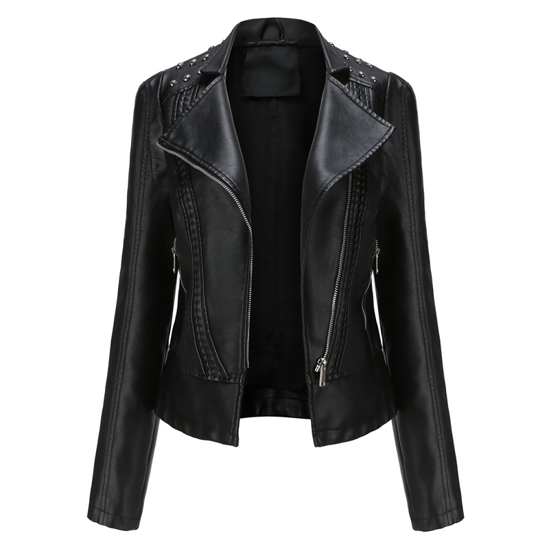 1. Fabric: This Rivets Long Sleeves Lapel Thin Short PU Leather Outerwear is constructed of a high-quality polyurethane (PU) leather to give a luxurious look and feel.