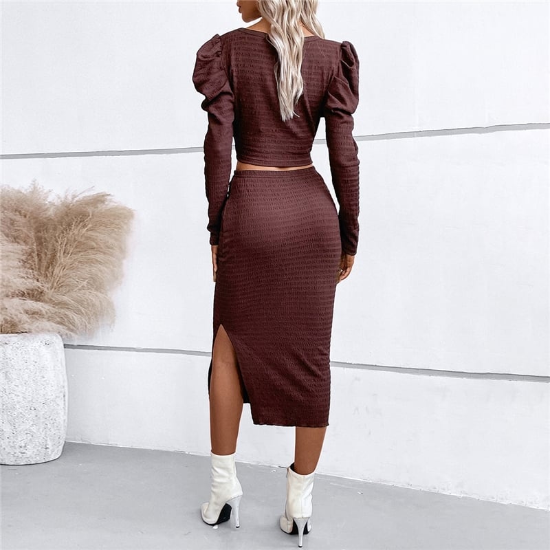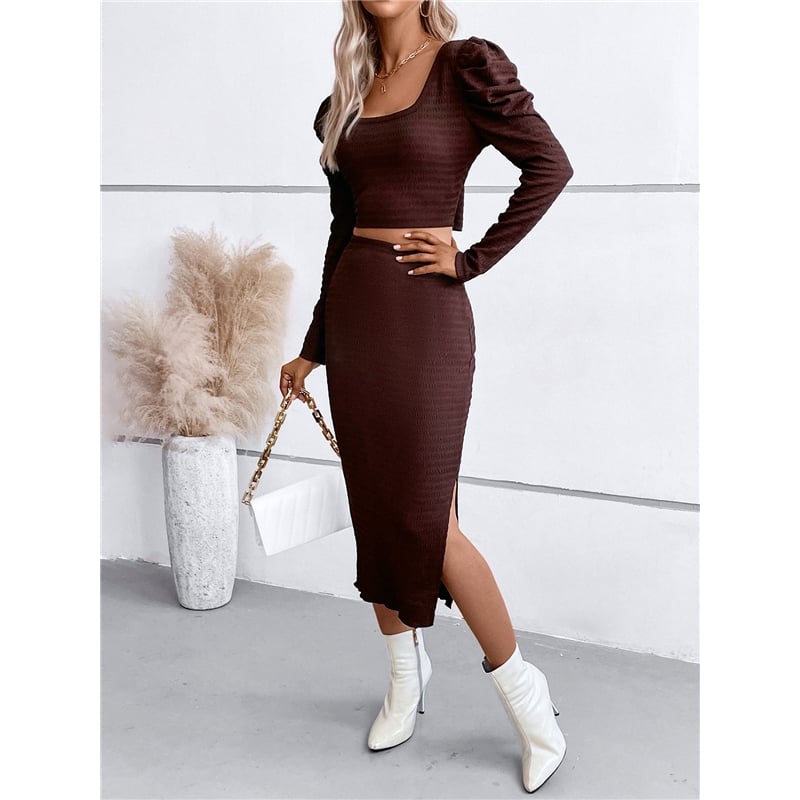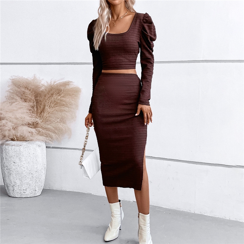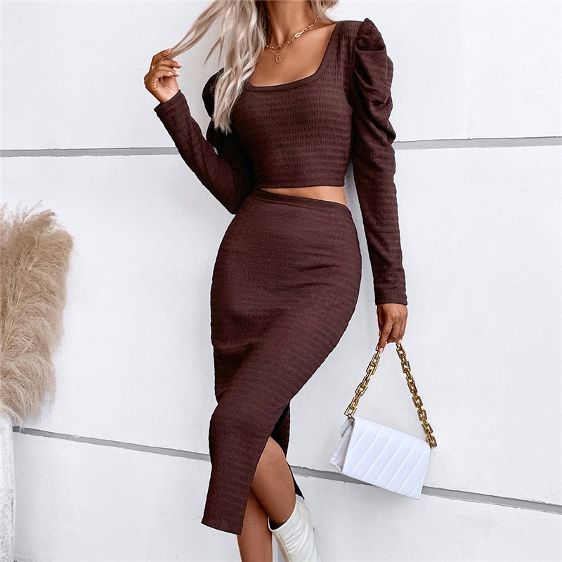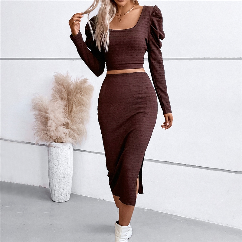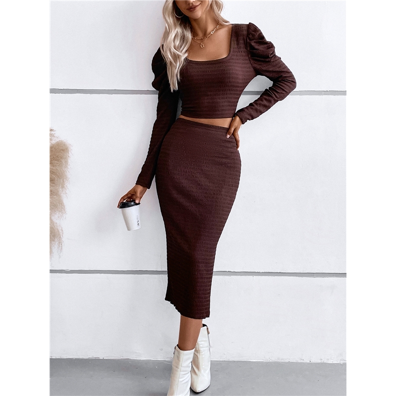 Solid Color Square Neck Long Sleeves Slim Top And Long Skirt Two Pieces Suit