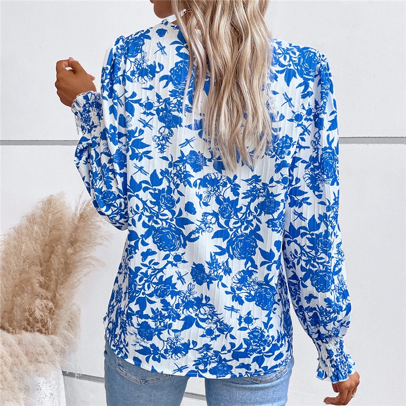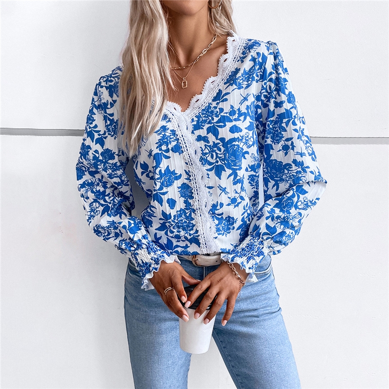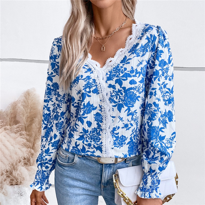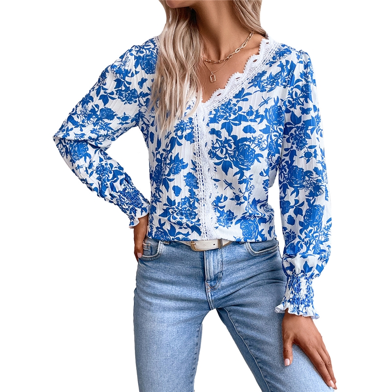 Long Sleeves V-Neck Printing Casual Loose Blouse Top