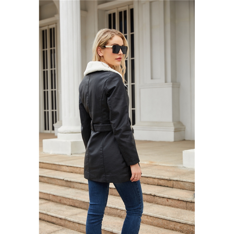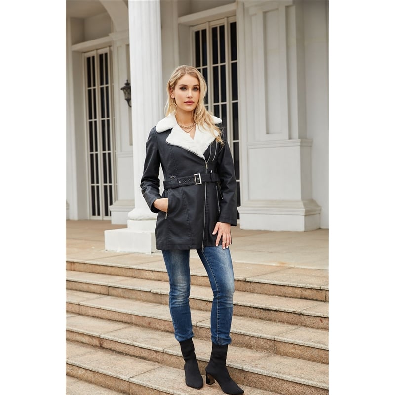 Long Sleeves Lapel Zipper Belted Fleece Lining Warm PU Leather Outerwear