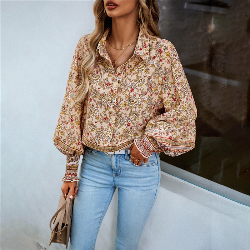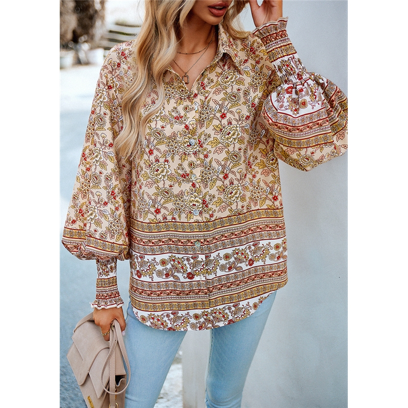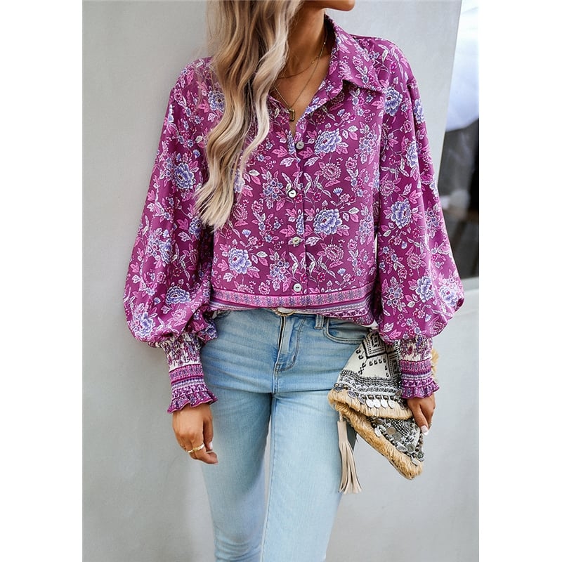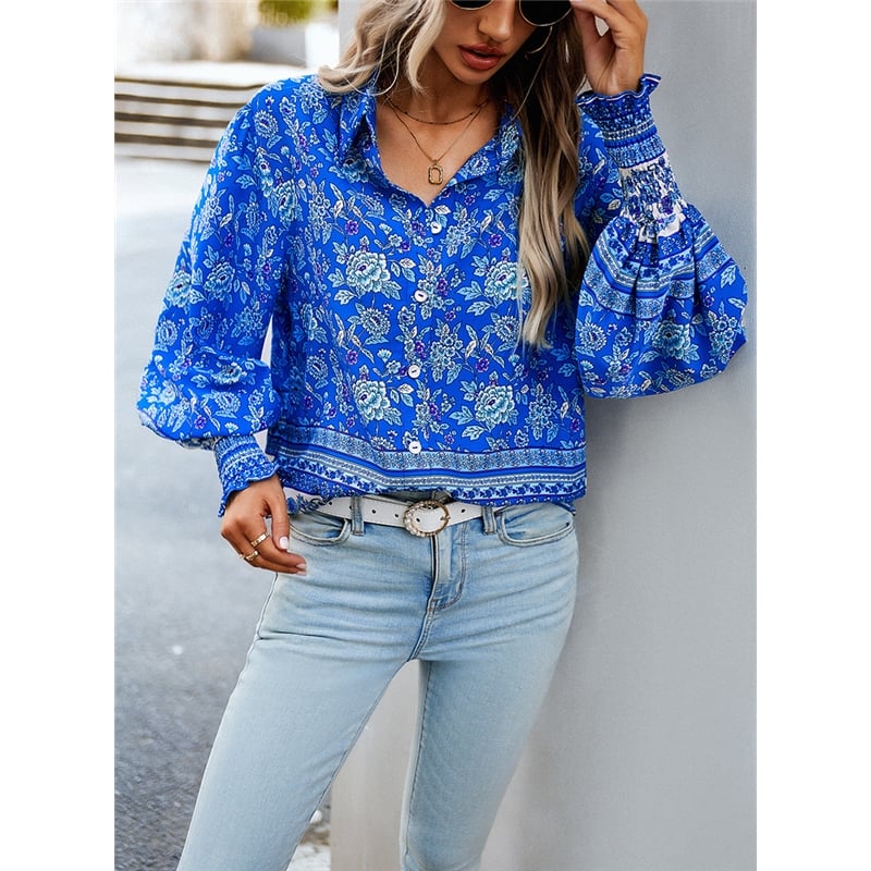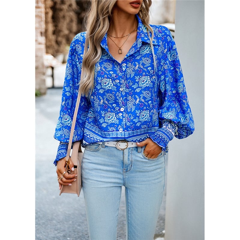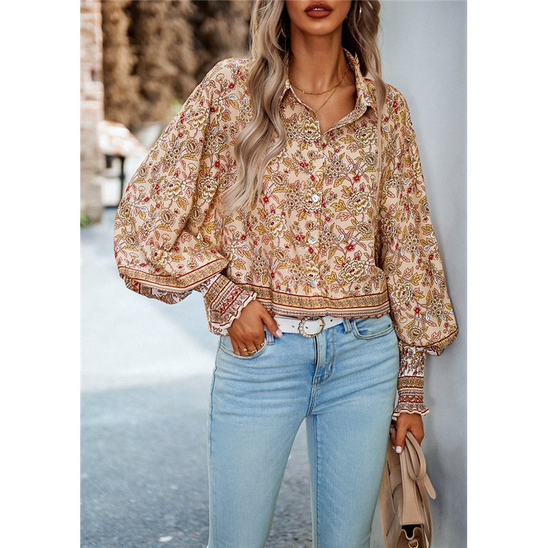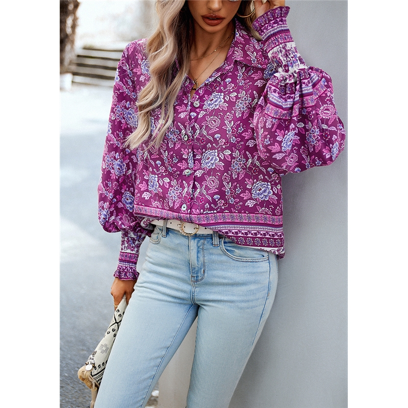 1. This casual puff sleeve button print shirt is made of a lightweight chambray fabric, giving it a relaxed, comfortable fit.