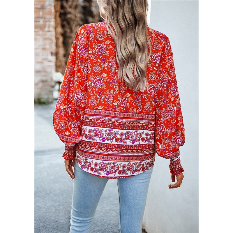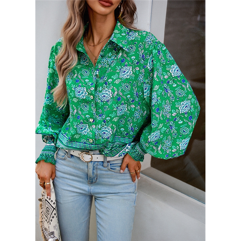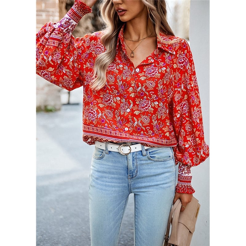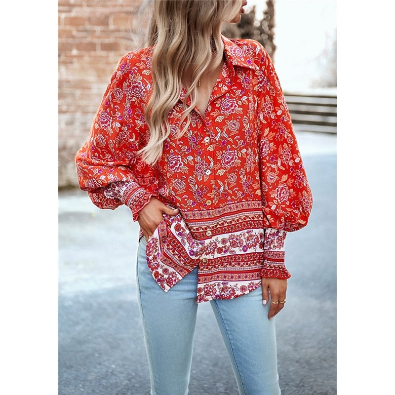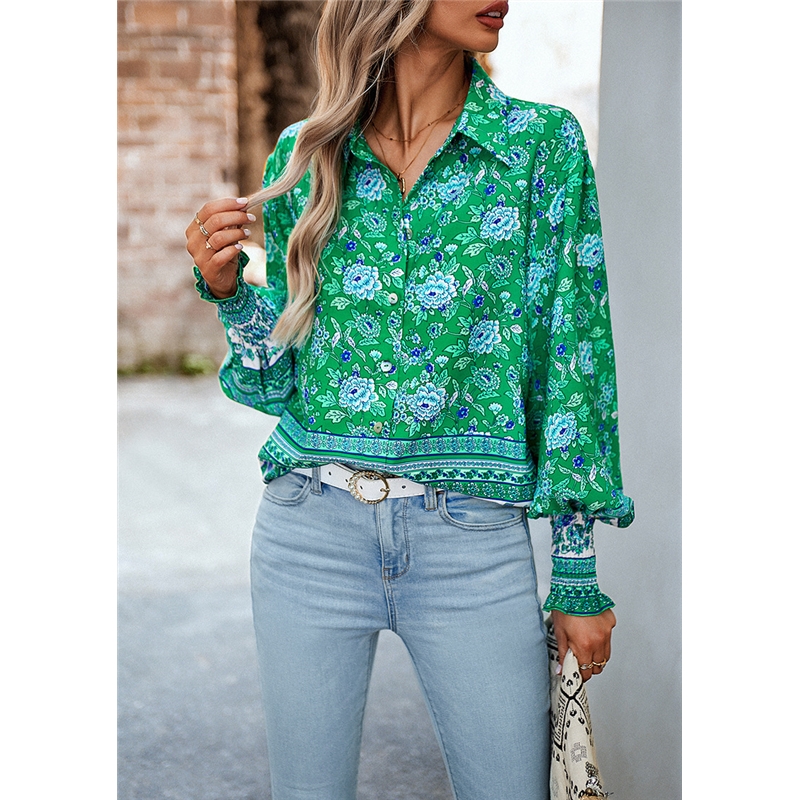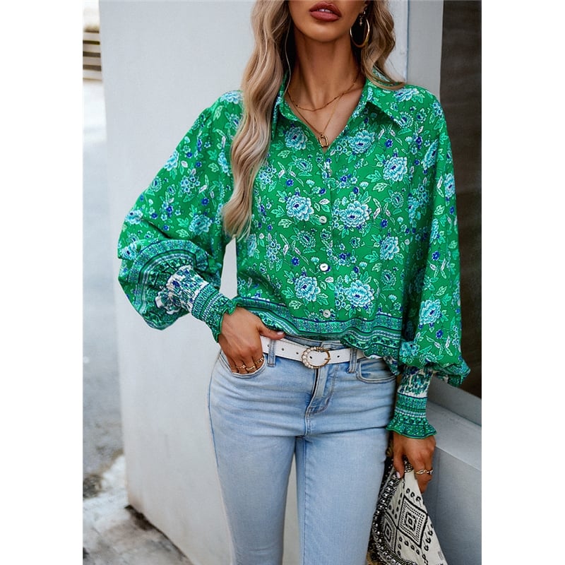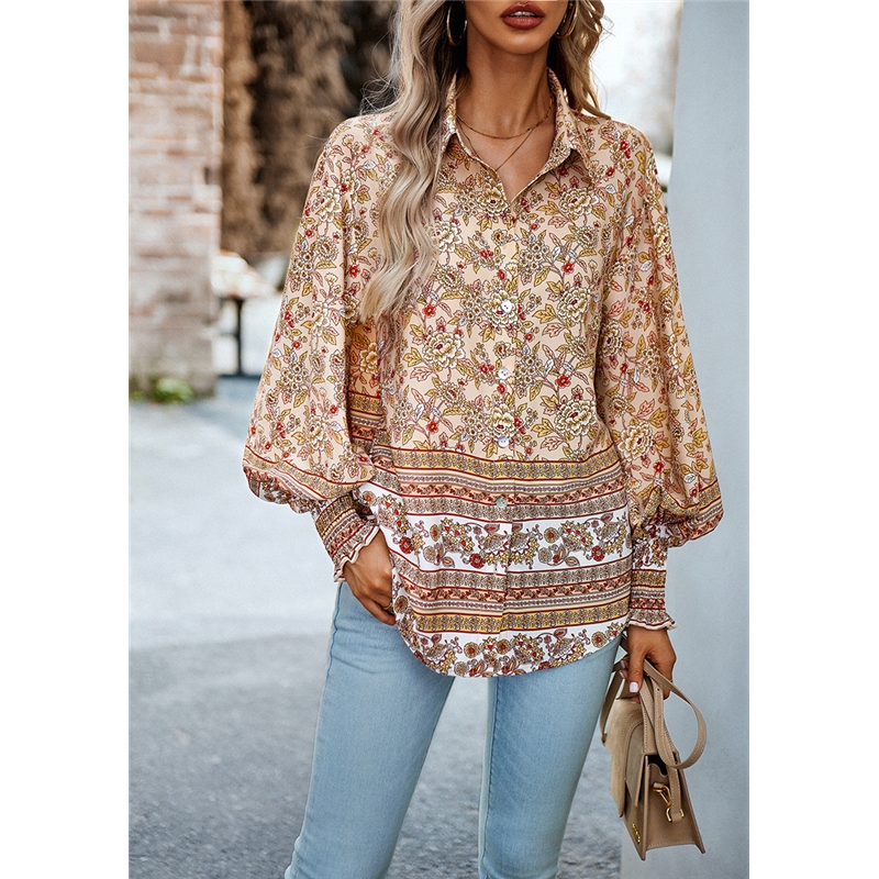 1. This casual puff sleeve button print shirt is made of a lightweight chambray fabric, giving it a relaxed, comfortable fit.