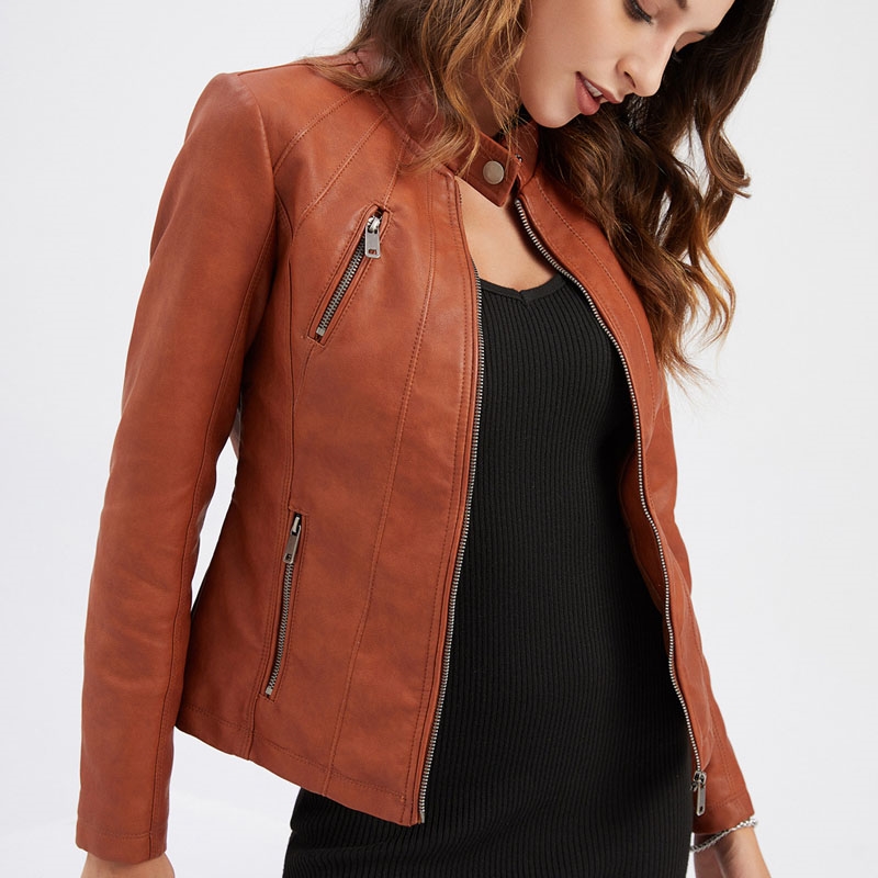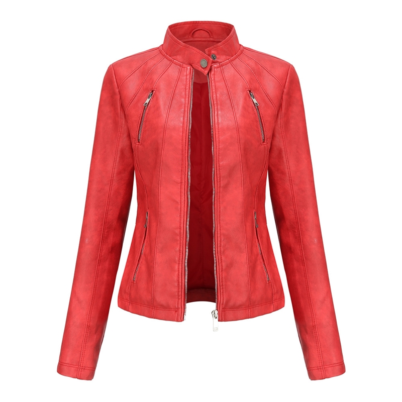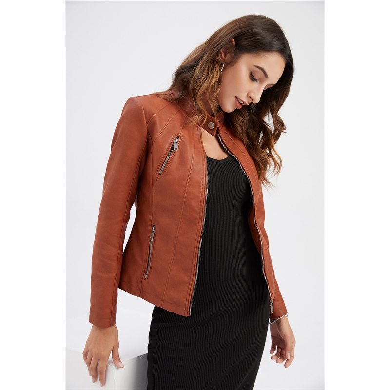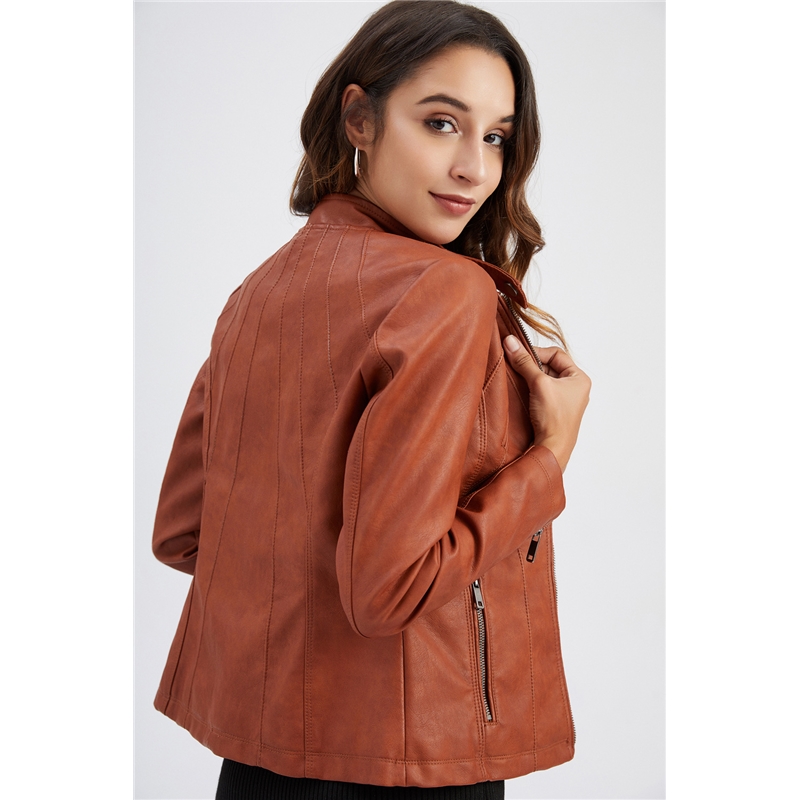 Stand Collar Long Sleeves Zipper Thin PU Leather Jacket Outerwear