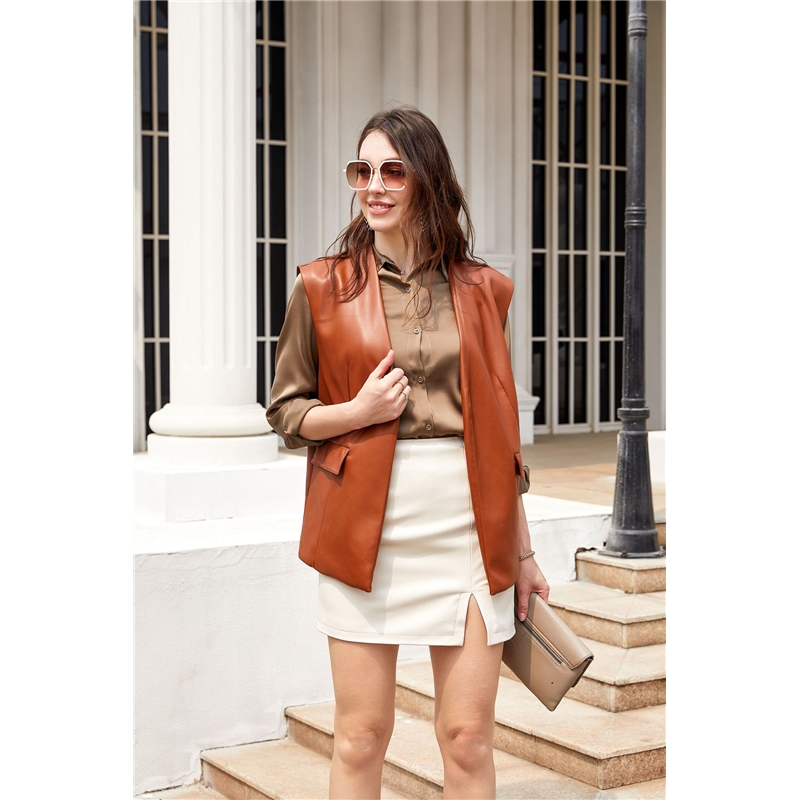 1. Fit: This sleeveless v-neck PU leather vest provides a fitted silhouette with its shape-hugging fabric.