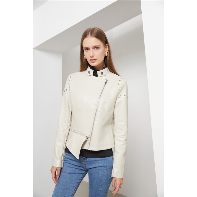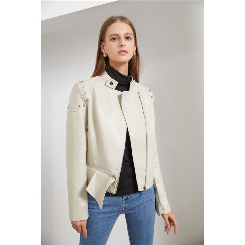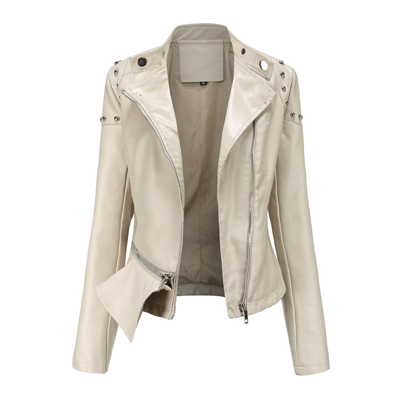 Long Sleeves Stand Collar Zipper Short Rivets PU Leather Outerwear